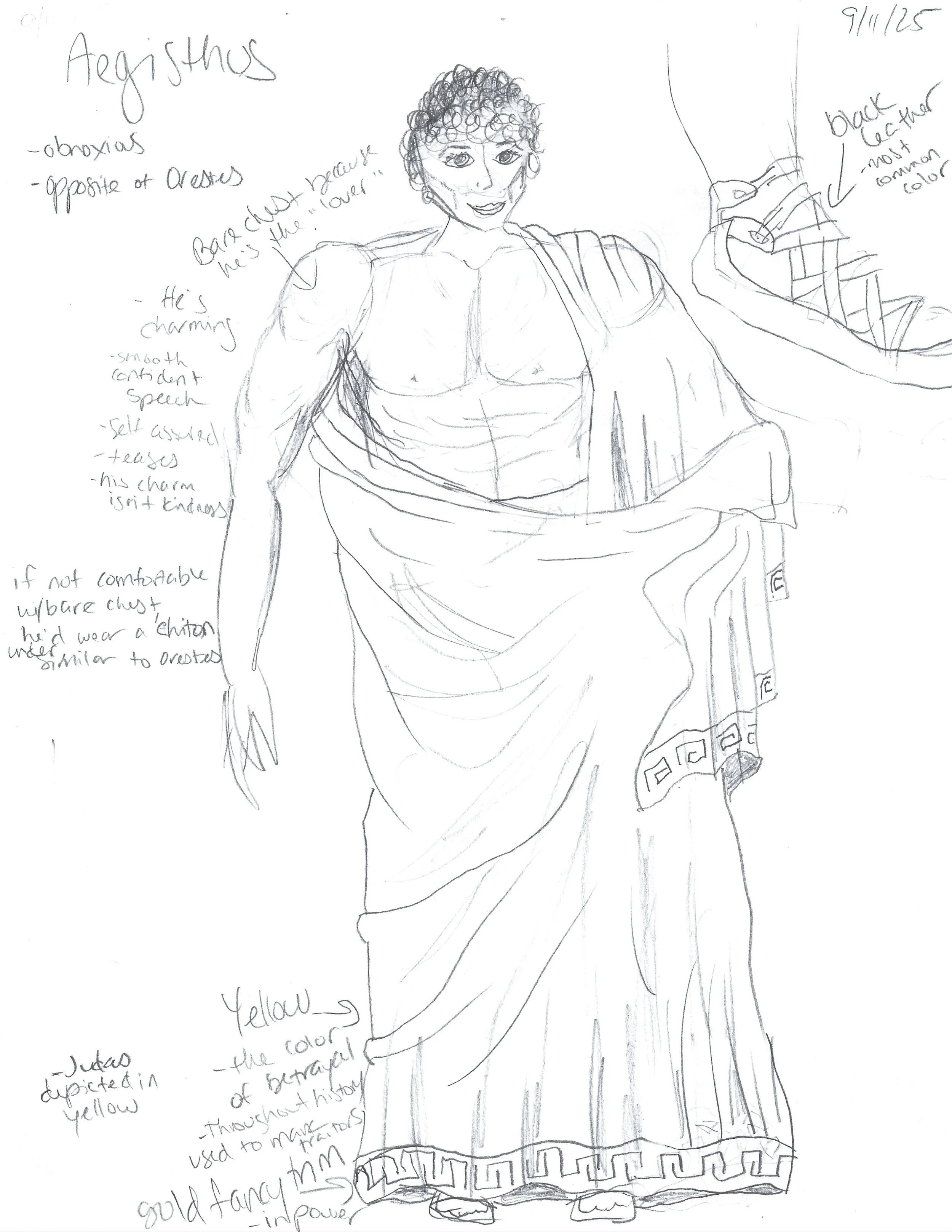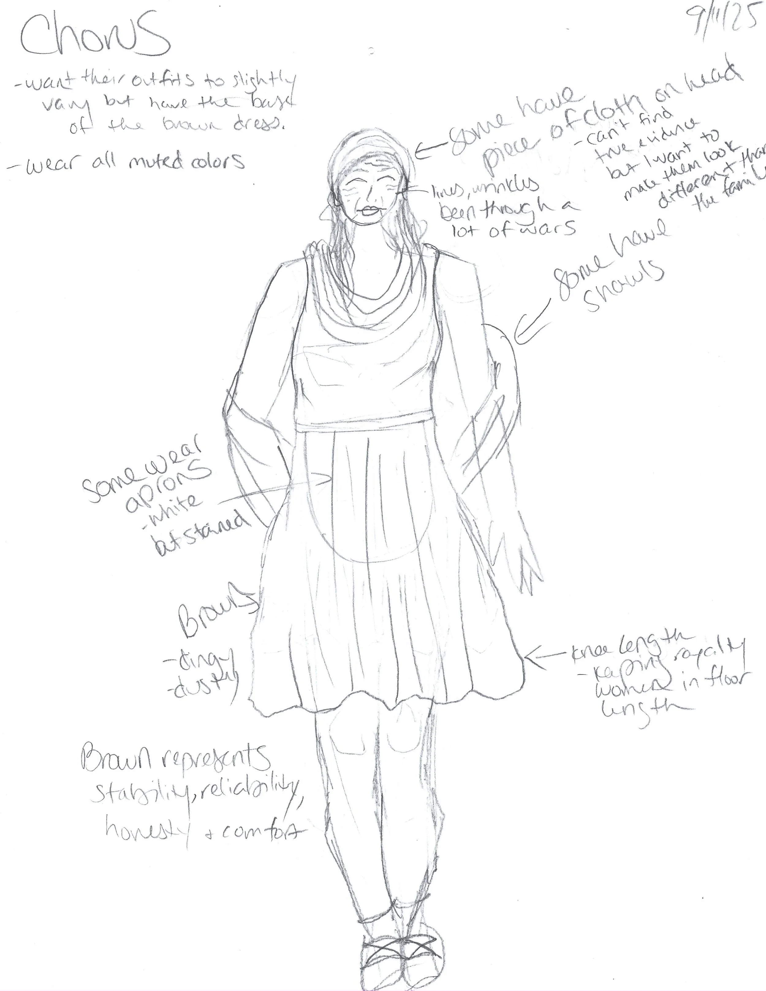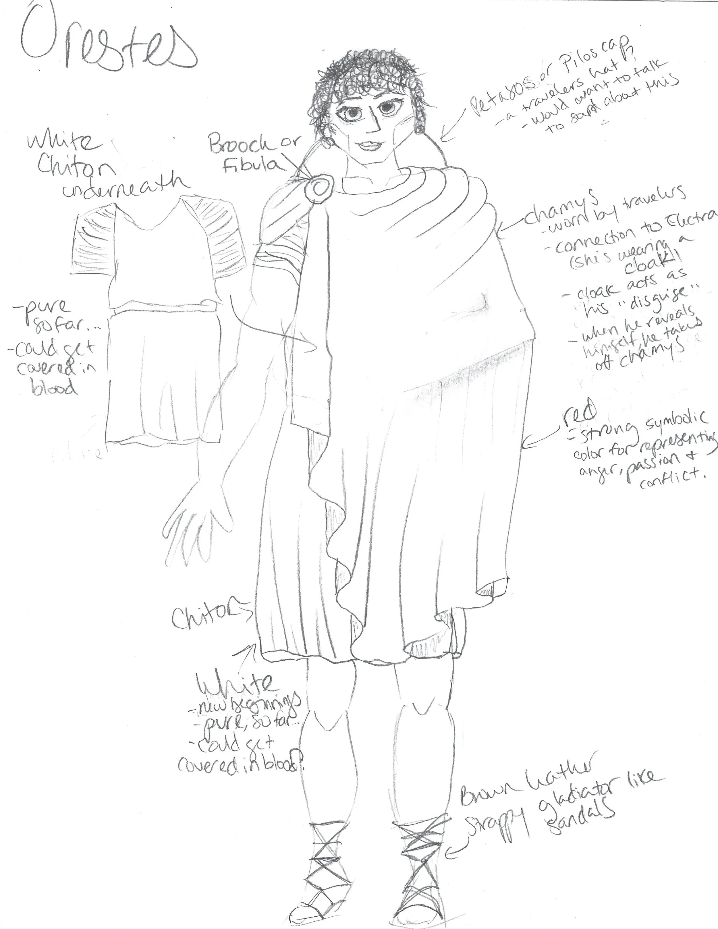 I also examined how linen and wool were draped and fastened using fibulae, and recreated these techniques in my renderings. The result was a collection grounded in historical research yet expressive of the play’s enduring themes (grief, vengeance, and fate) through authentic movement, texture, and form.Rough Sketches